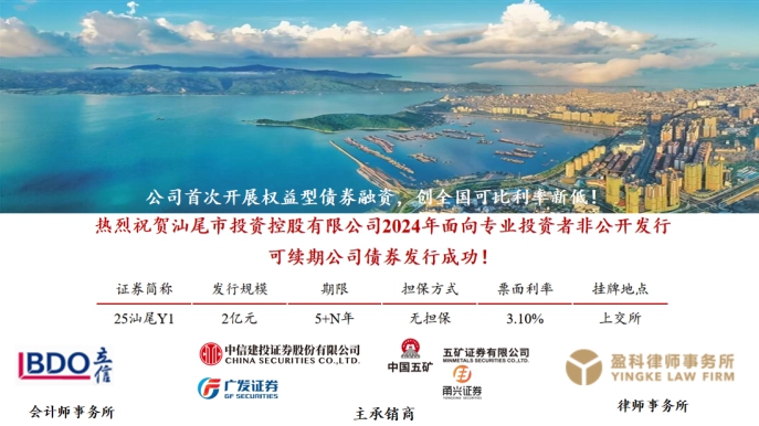 2025年2月19日,bevictor伟德(以下简称“bevictor伟德公司”)在上海证券交易所成功发行2亿元无担保可续期公司债券,发行期限5+N年期,票面利率3.10%,本次为公司首次发行权益类产品,发行利率创公司历年发行公司债券利率新低。 本次成功发行可续期公司债券,是公司对权益型债券产品融资的一次全新探索,也是融资模式的进一步创新突破,有效降低公司资产负债水平和融资成本,提升公司刚性债务保障能力,为公司后续承接重大项目打下了坚实基础。下来,bevictor伟德公司将紧紧围绕省委“1310”具体部署和市委“1+2+9”工作安排,进一步提升资产规模、拓宽融资渠道、创新融资模式,奋力提升国企战略支撑能力,引导推动优质金融资源聚焦重点产业,为汕尾经济社会高质量发展贡献更多bevictor伟德力量。